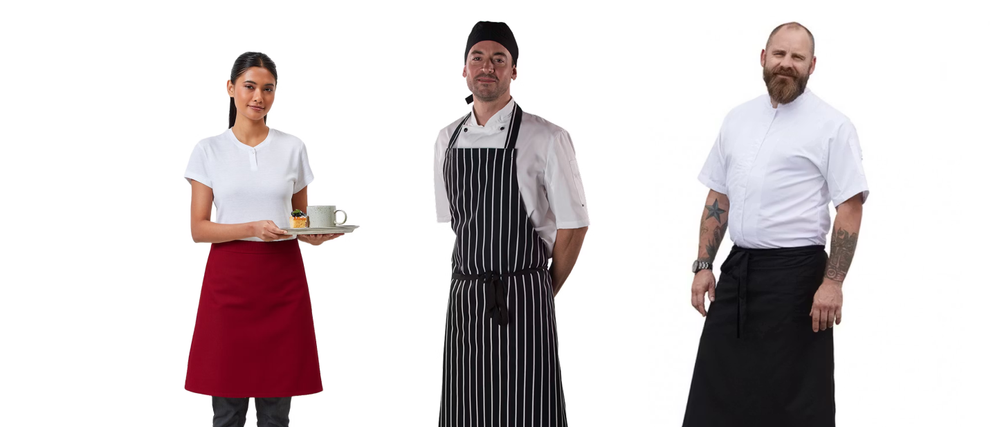 Förklädet är ofta den mest använda delen av köksklädseln. Det skyddar mot stänk och smuts, men är också en viktig del av restaurangens visuella identitet.