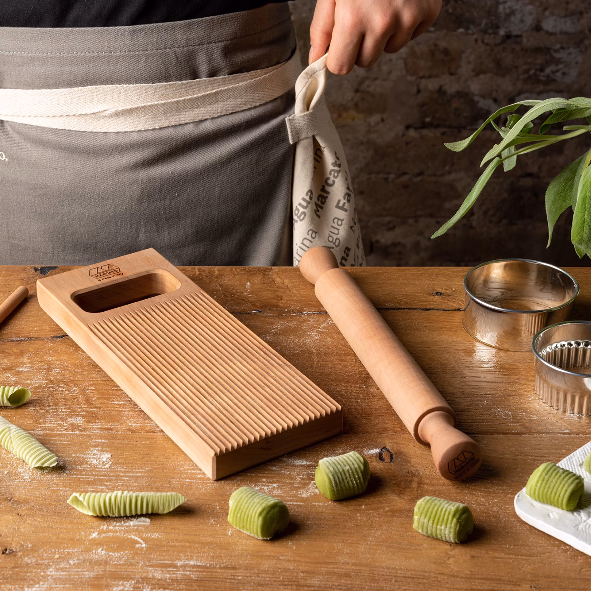 Marcato Gnocchi Like a Pro Deluxe är ett komplett gåvoset för att tillverka olika typer av gnocchi och fylld pasta med professionellt resultat. Setet innehåller en gnocchibräda och kavel i päronträ, en garganellipinne samt två olika utstickare för Gnocchi alla Romana, vilket ger stor variation i form och teknik. Medföljande receptsamling gör det enkelt att komma igång och utforska olika traditionella pastarecept, och det medföljande förklädet gör setet till en uppskattad present för både hemmakockar och matentusiaster.