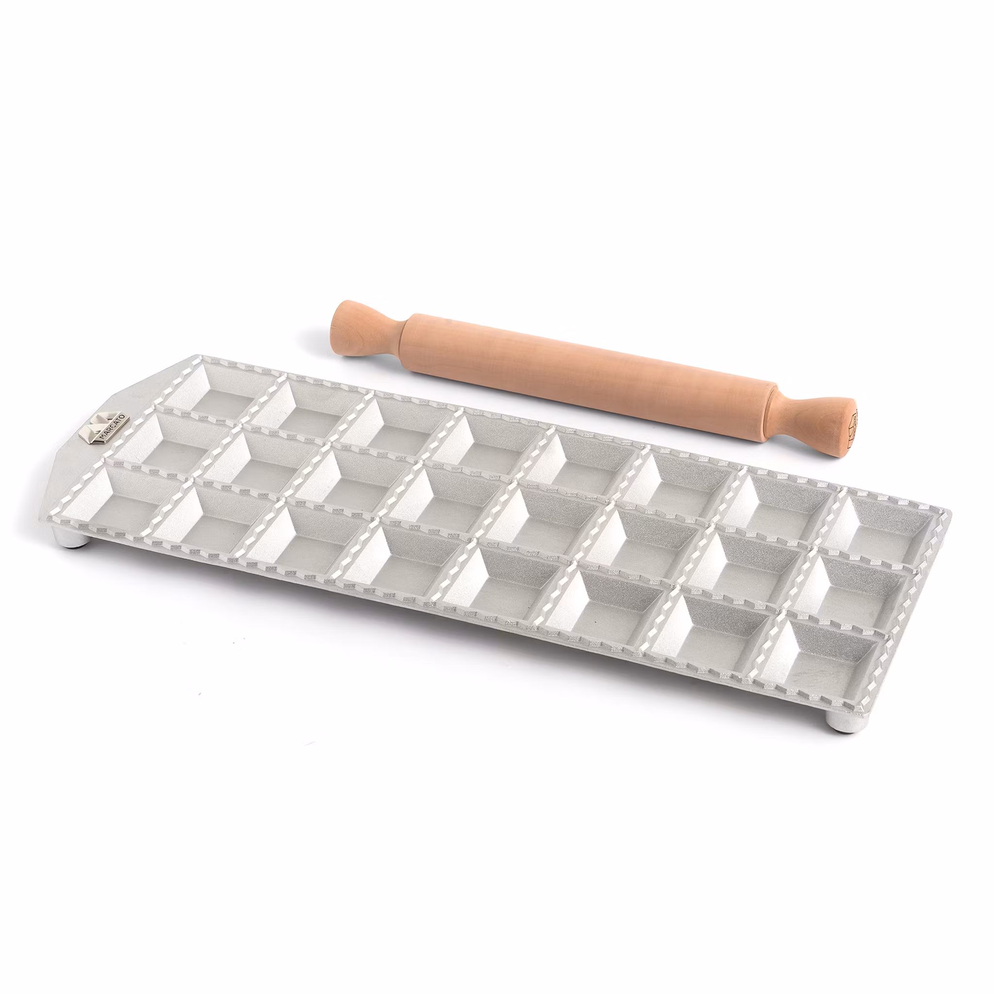 Marcato ravioliplåt (Square) inklusive kavel, avsedd för att snabbt och enkelt göra 24 mellanstora, kvadratiska ravioli åt gången. Formen hjälper till att både portionera, försluta och skära pastan i ett effektivt moment, vilket ger jämna och professionella resultat.