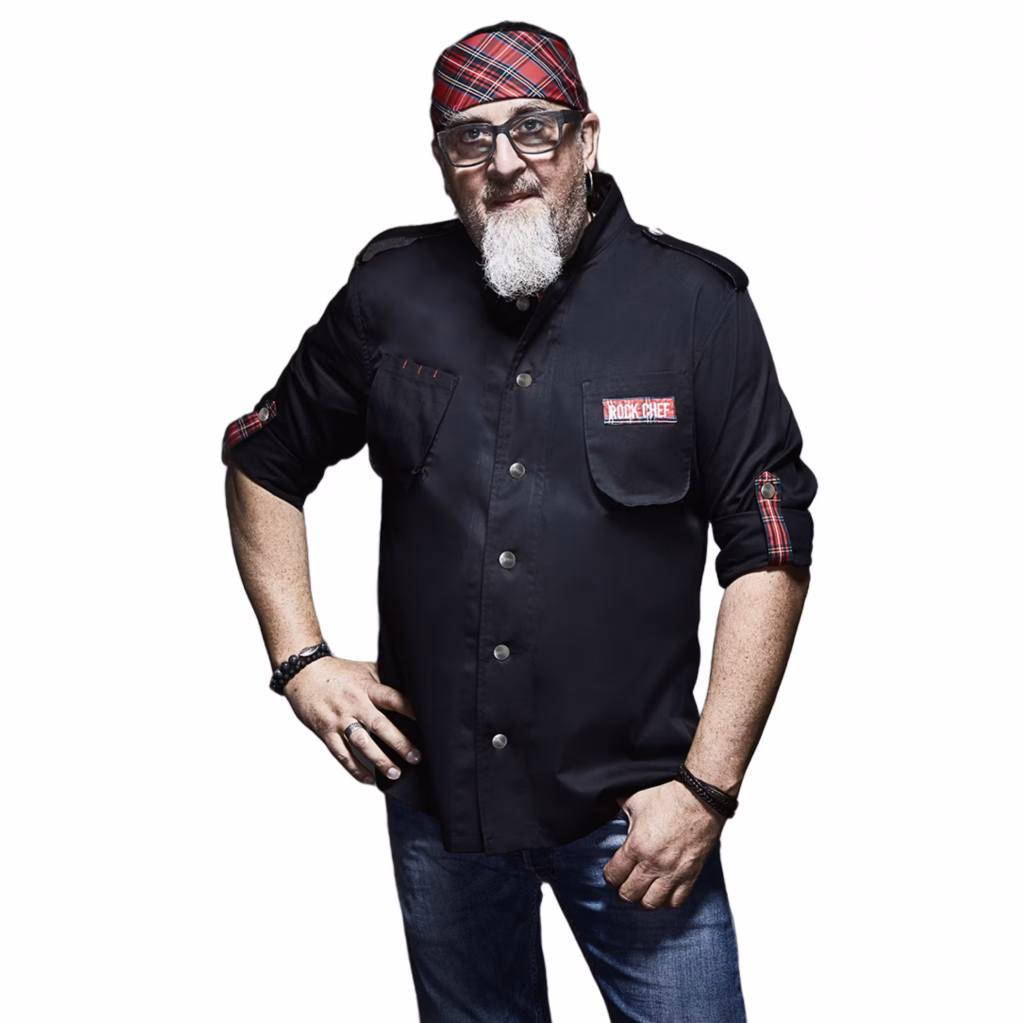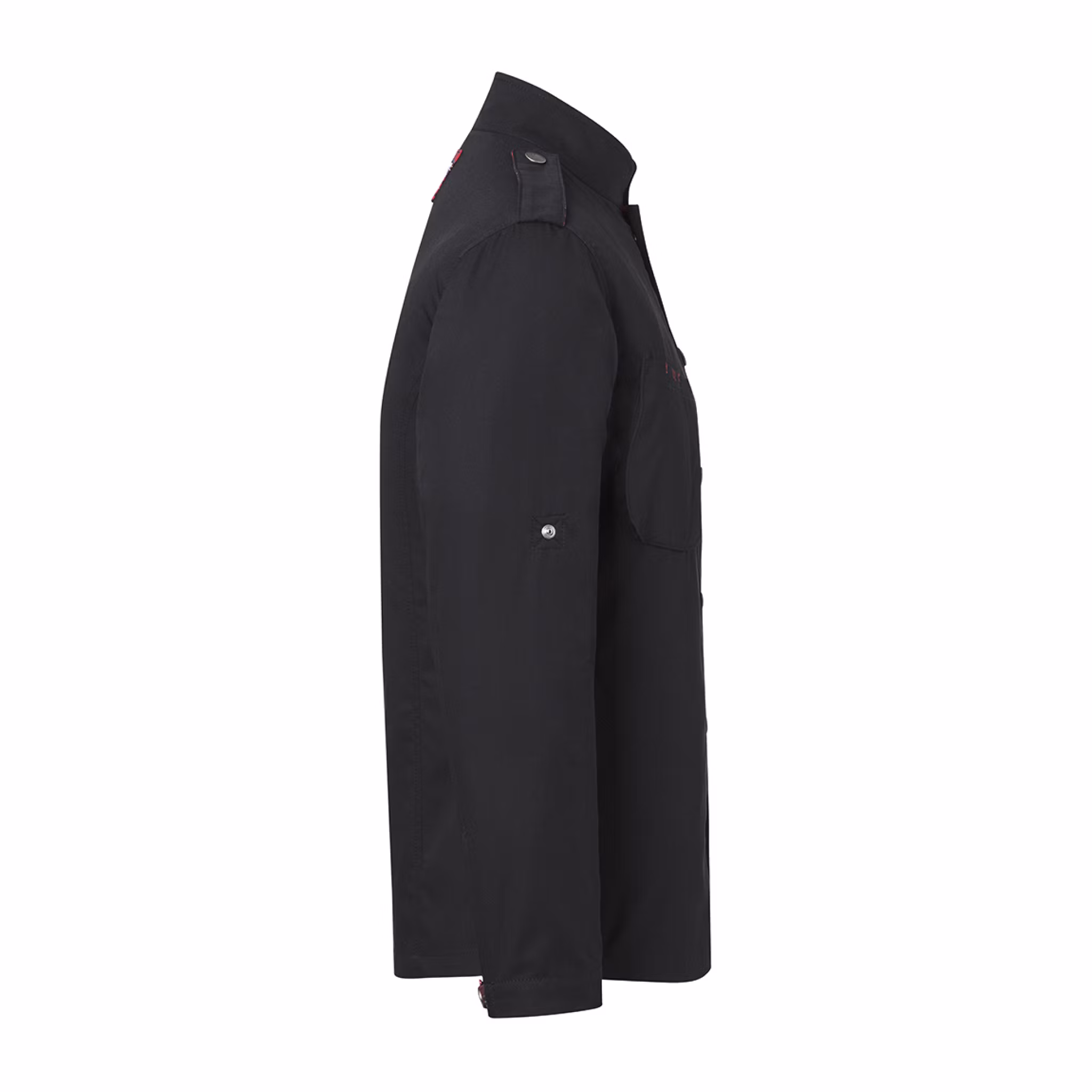 Modern kockjacka i lätt och sval bomullskvalitet, framtagen för arbete i varma köksmiljöer. Designen kombinerar funktionalitet med ett trendinspirerat uttryck, där detaljer från rockstilen ger ett mer uttrycksfullt och professionellt intryck.
