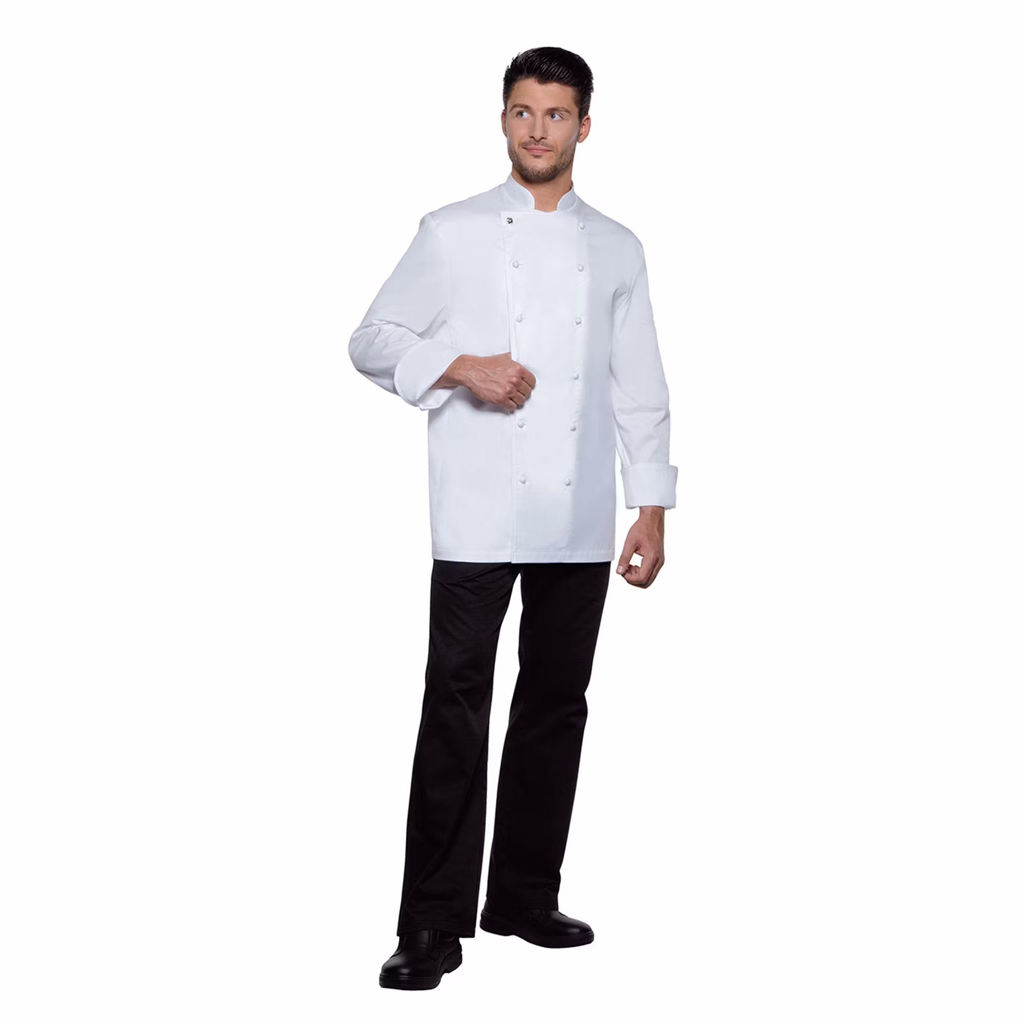 Exklusiv kockjacka i lätt och fin pima bomull med klassisk passform, utvecklad för professionella kök där komfort och elegans står i fokus. Den tunna och högkvalitativa bomullen ger en sval och behaglig känsla, samtidigt som materialet är slitstarkt och lättskött.