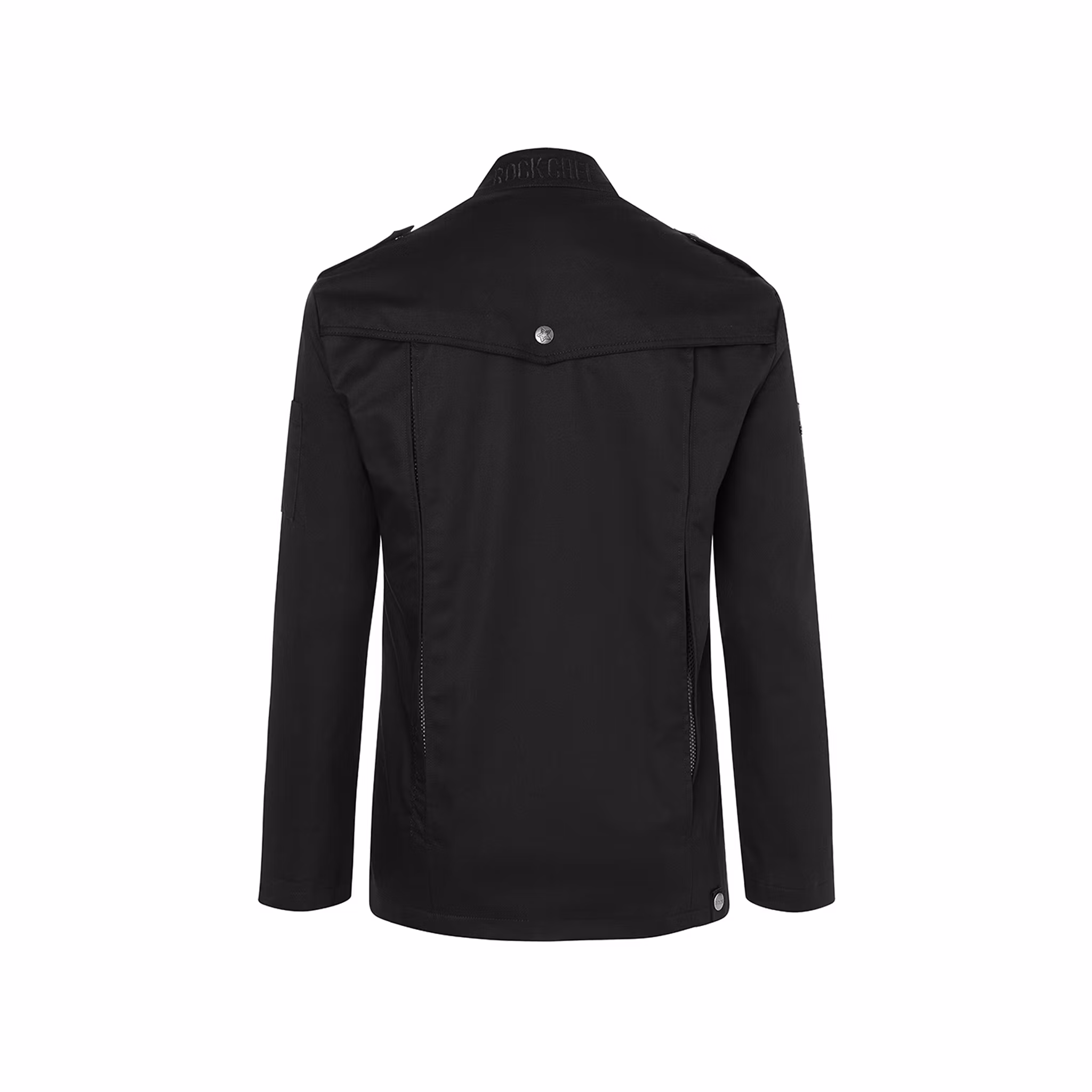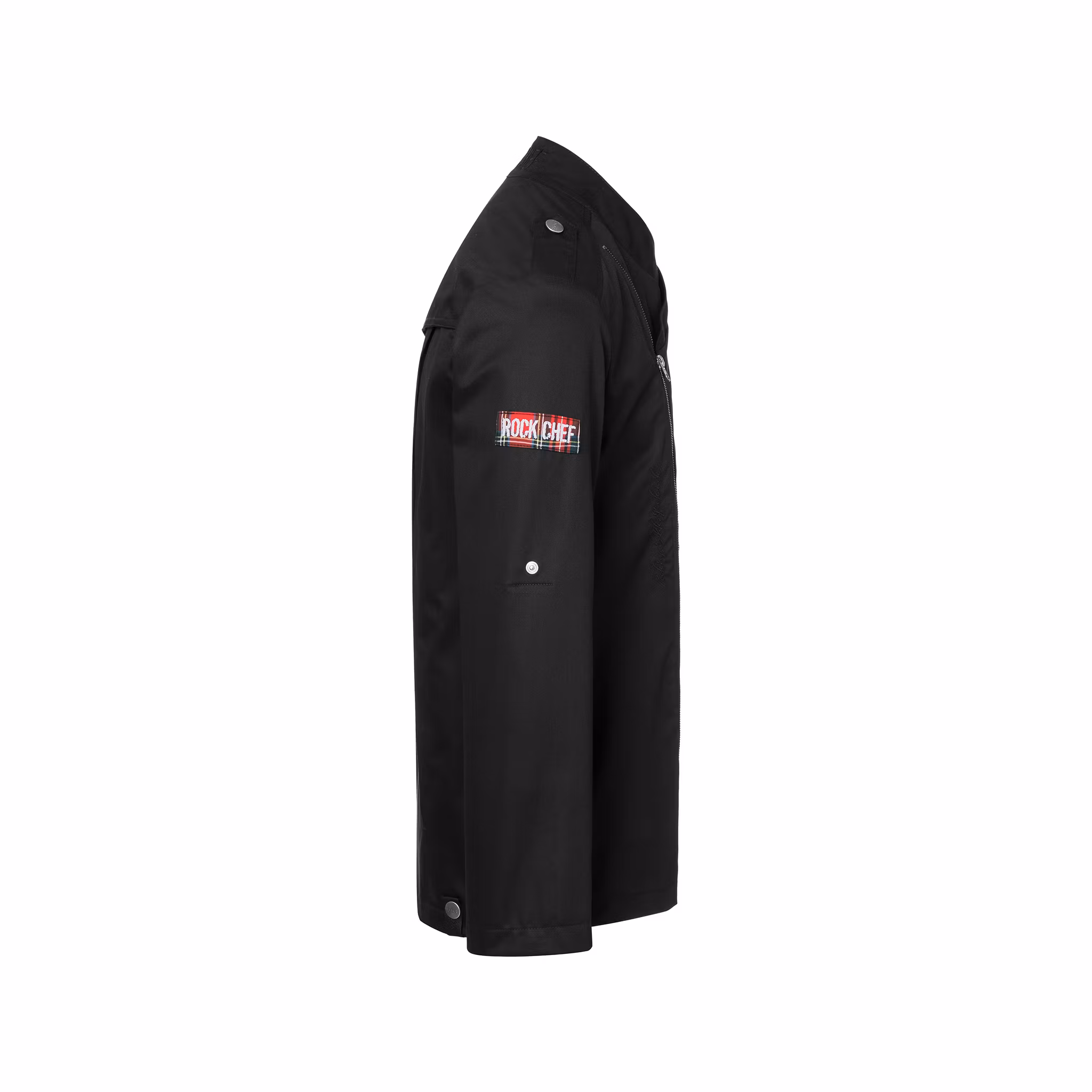 Modern kockjacka i bikerinspirerad design som kombinerar stil med funktion. Jackan är utvecklad för professionella köksmiljöer där rörelsefrihet, ventilation och slitstyrka är avgörande under långa arbetspass.
