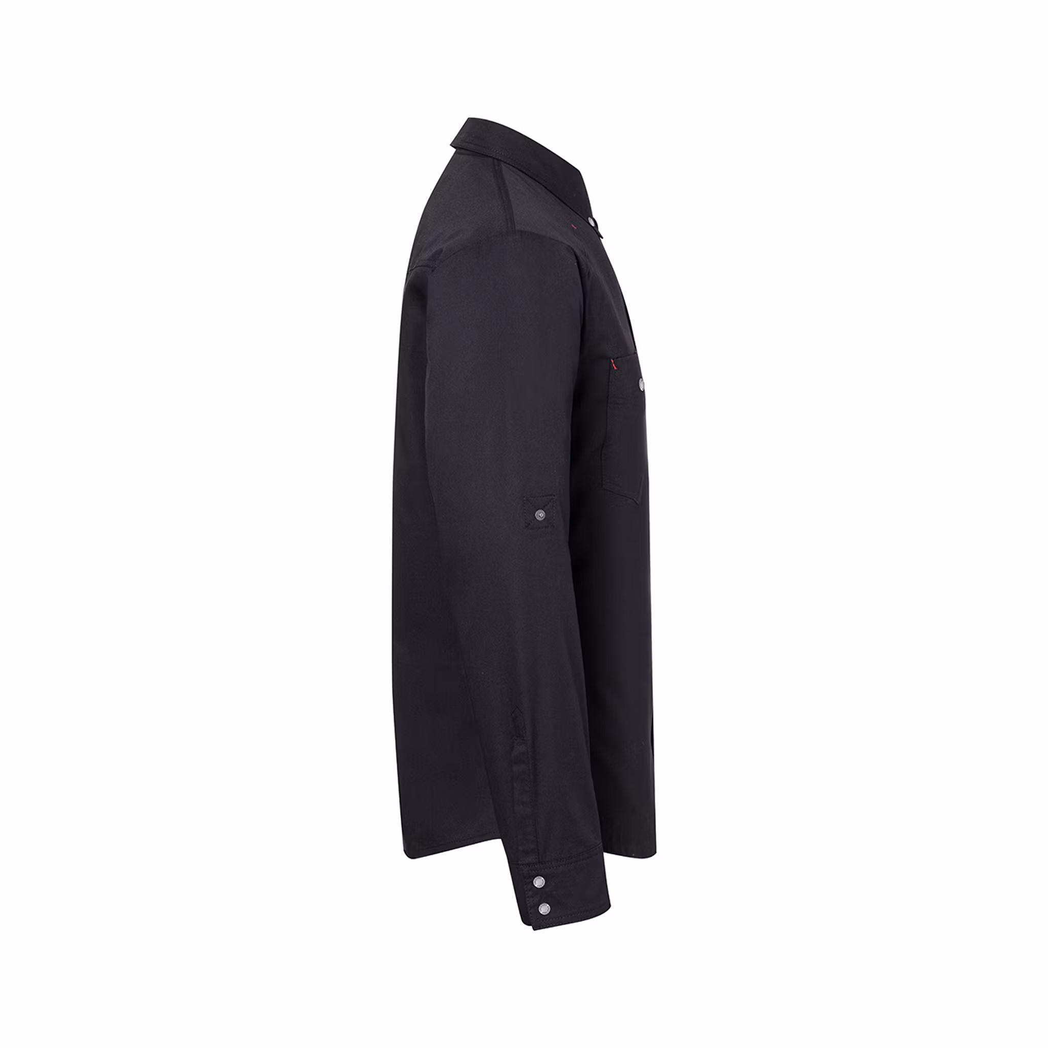 Lätt och bekväm kockskjorta i modern design, utvecklad för varma arbetsmiljöer där rörelsefrihet och ventilation är viktigt. Den tunna bomullskvaliteten ger en sval och behaglig känsla under hela arbetsdagen, samtidigt som den stilrena designen passar professionella kök.