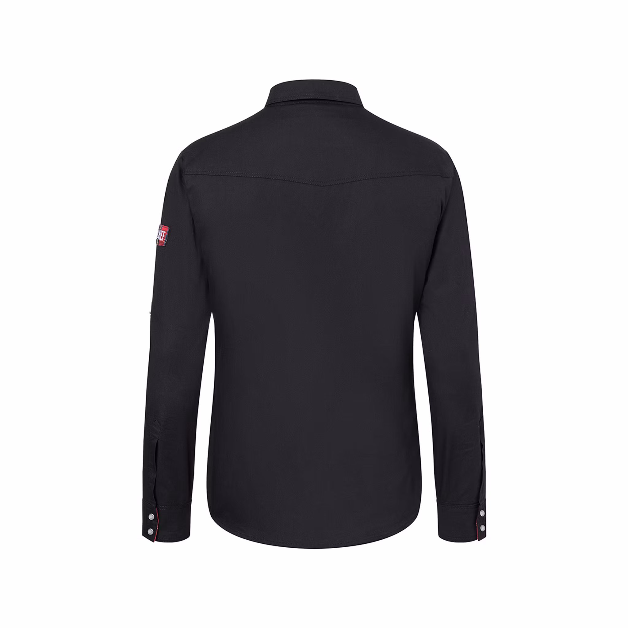 Skjortan har en button-down krage och tryckknappar framtill för snabb och smidig hantering. Ärmarna kan enkelt rullas upp och fästas med flikar. Två bröstfickor ger plats för mindre tillbehör som pennor eller mobil, och detaljer inspirerade av rockstilen ger ett modernt uttryck.