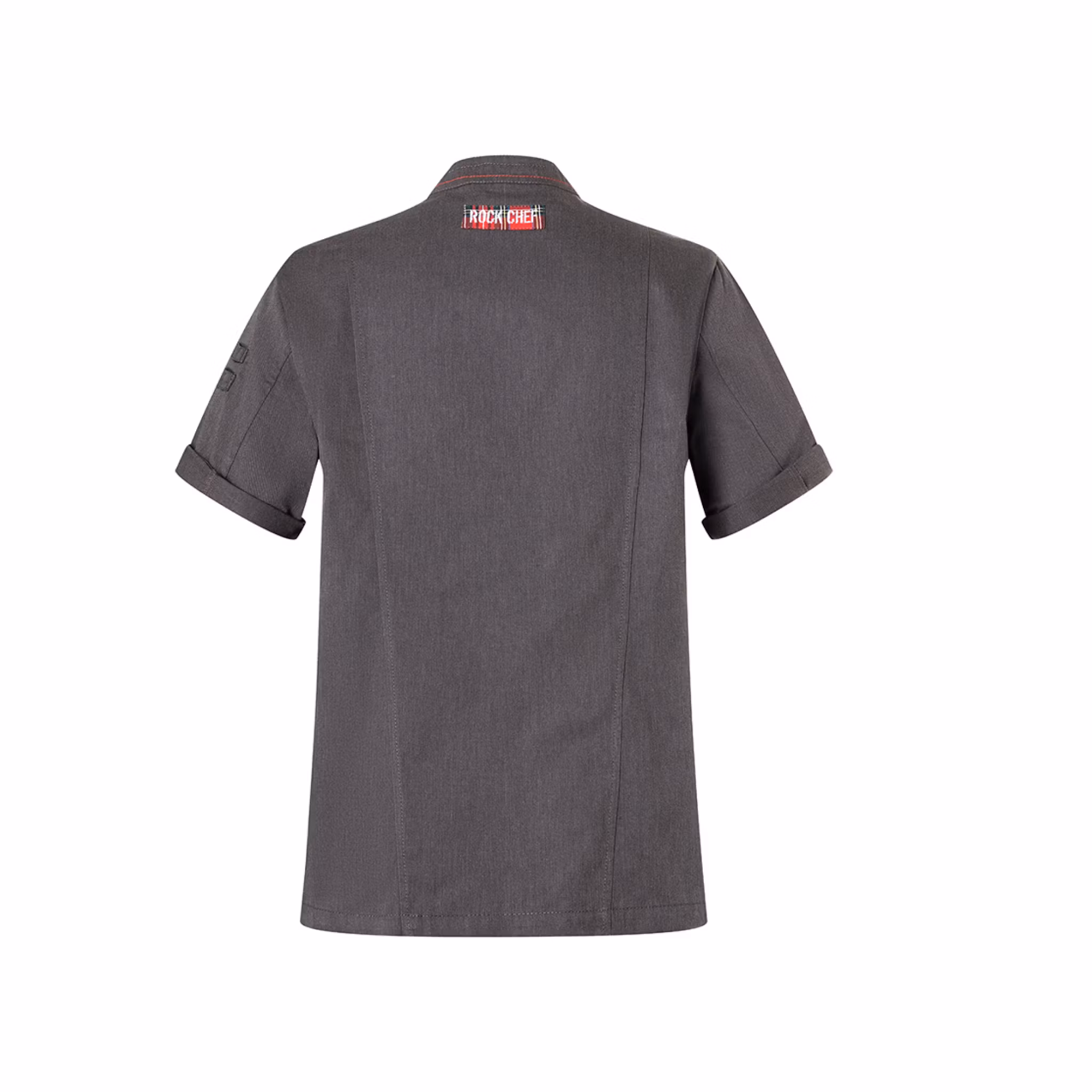 En uttrycksfull kockrock i denimlook från ROCK CHEF®-Stage2-serien, inspirerad av den brittiska rockscenen. Designen kombinerar ett rakt snitt med tydliga kontrastdetaljer som ger ett modernt och karaktärsfullt uttryck i köket, samtidigt som materialet är slitstarkt och lättskött.
