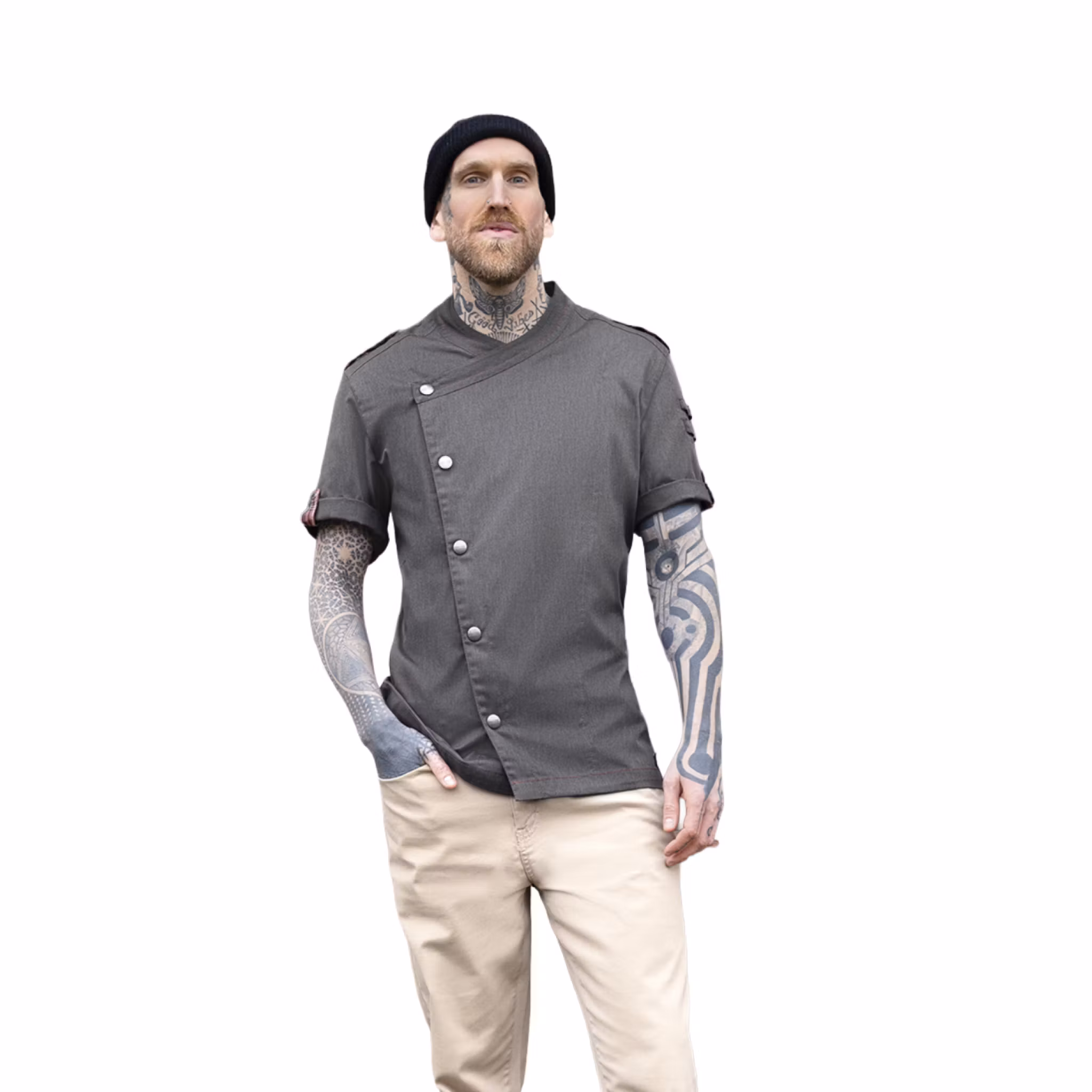 Den asymmetriska knäppningen med tryckknappar ger en distinkt stil och gör plagget smidigt att använda i vardagen. Den kortärmade designen passar bra i varmare arbetsmiljöer, och praktiska öglor gör det enkelt att bära mindre verktyg nära till hands.