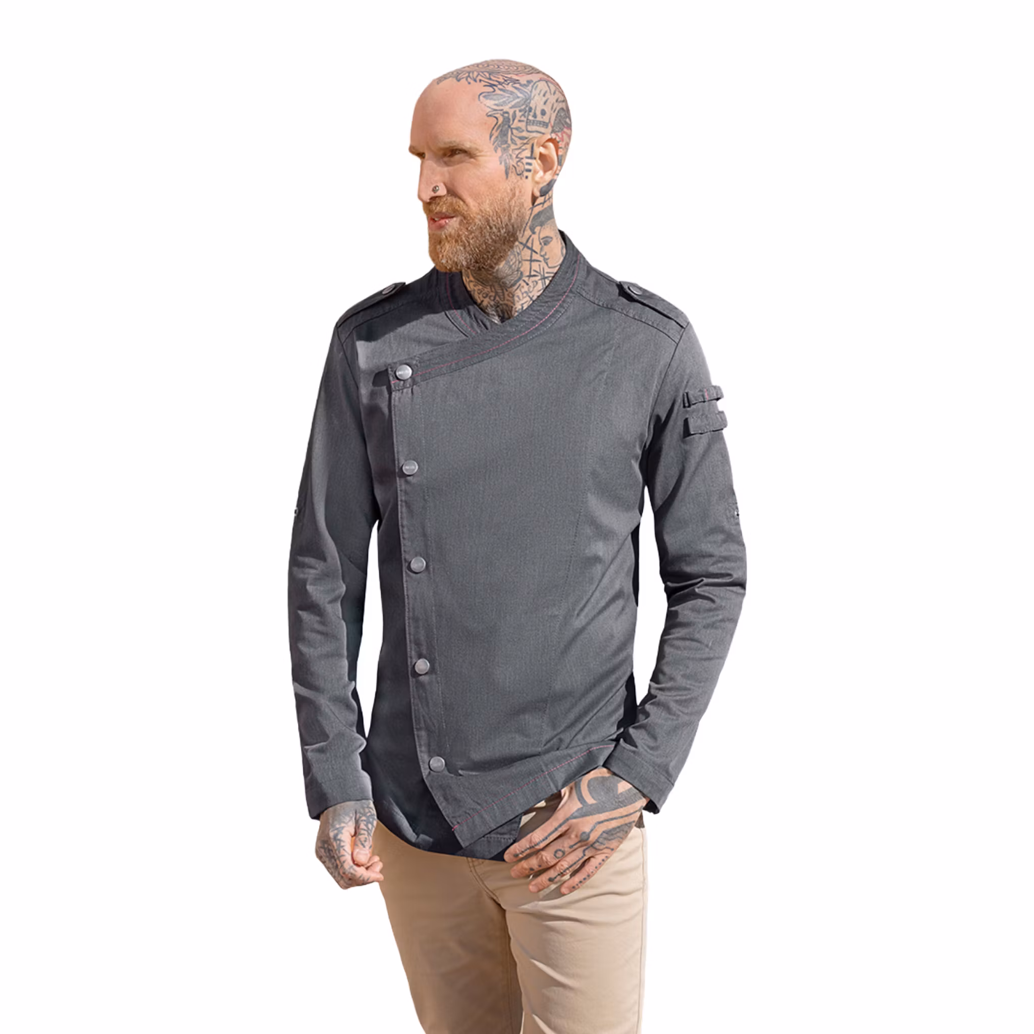 Den asymmetriska knäppningen med tryckknappar ger ett distinkt utseende och gör plagget smidigt att hantera under arbetspasset. Den långärmade designen ger extra skydd, medan praktiska öglor gör det enkelt att bära mindre verktyg nära till hands.