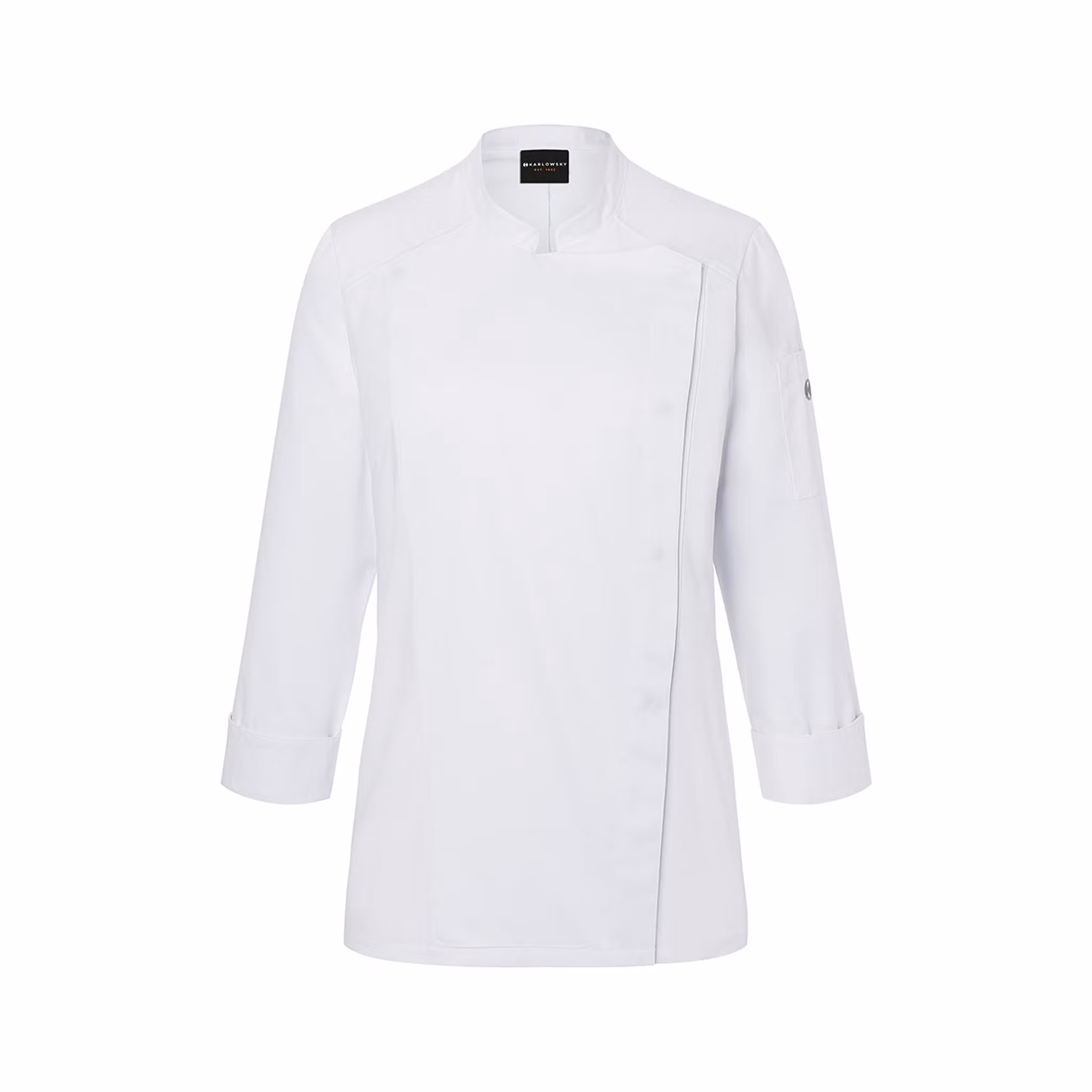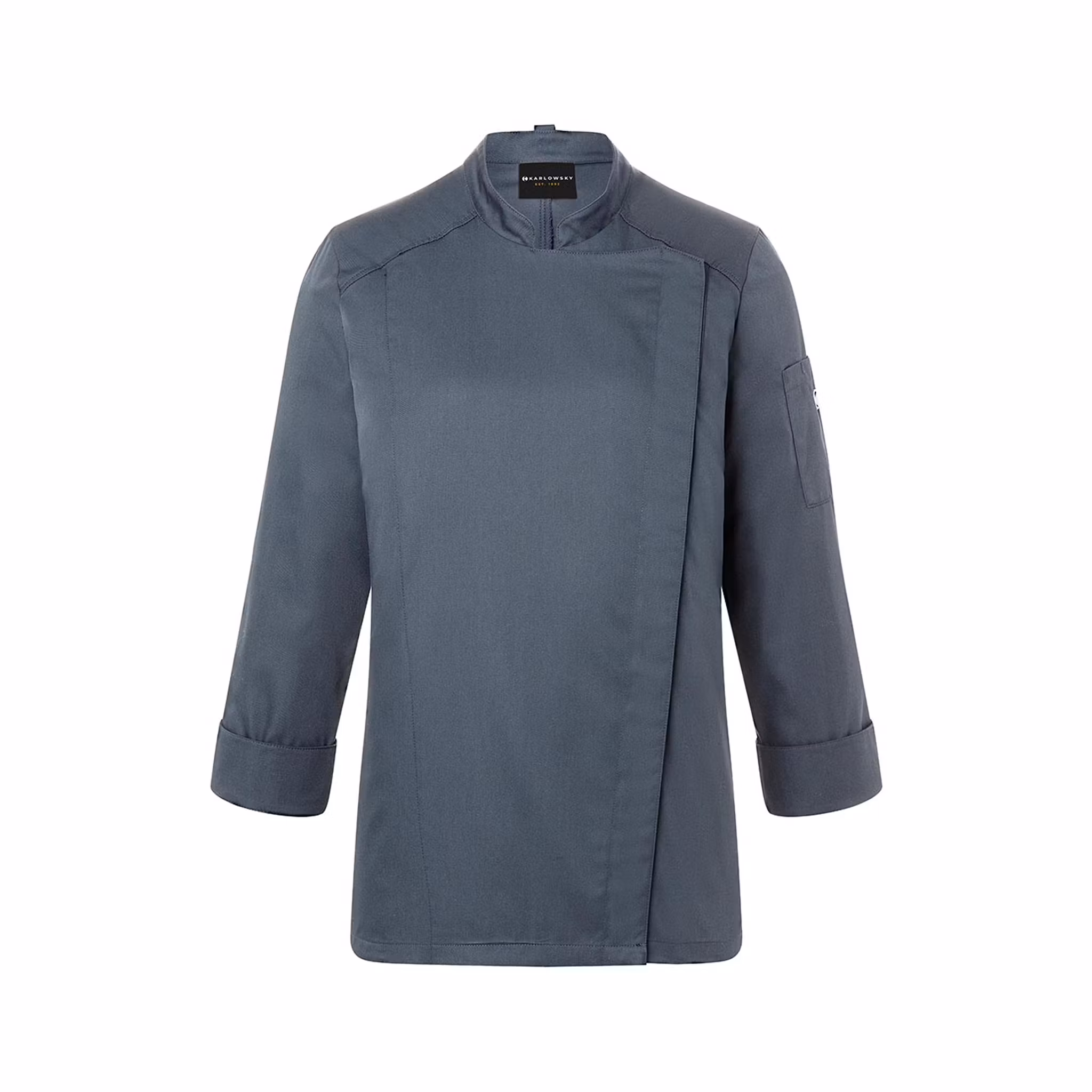 Den figurnära passformen ger ett skräddat uttryck samtidigt som den dolda knäppningen med tryckknappar bidrar till en ren och modern look. Jackan är utrustad med en praktisk nackrem som håller förklädet på plats samt ärmficka med pennfack för smidig förvaring av mindre tillbehör.