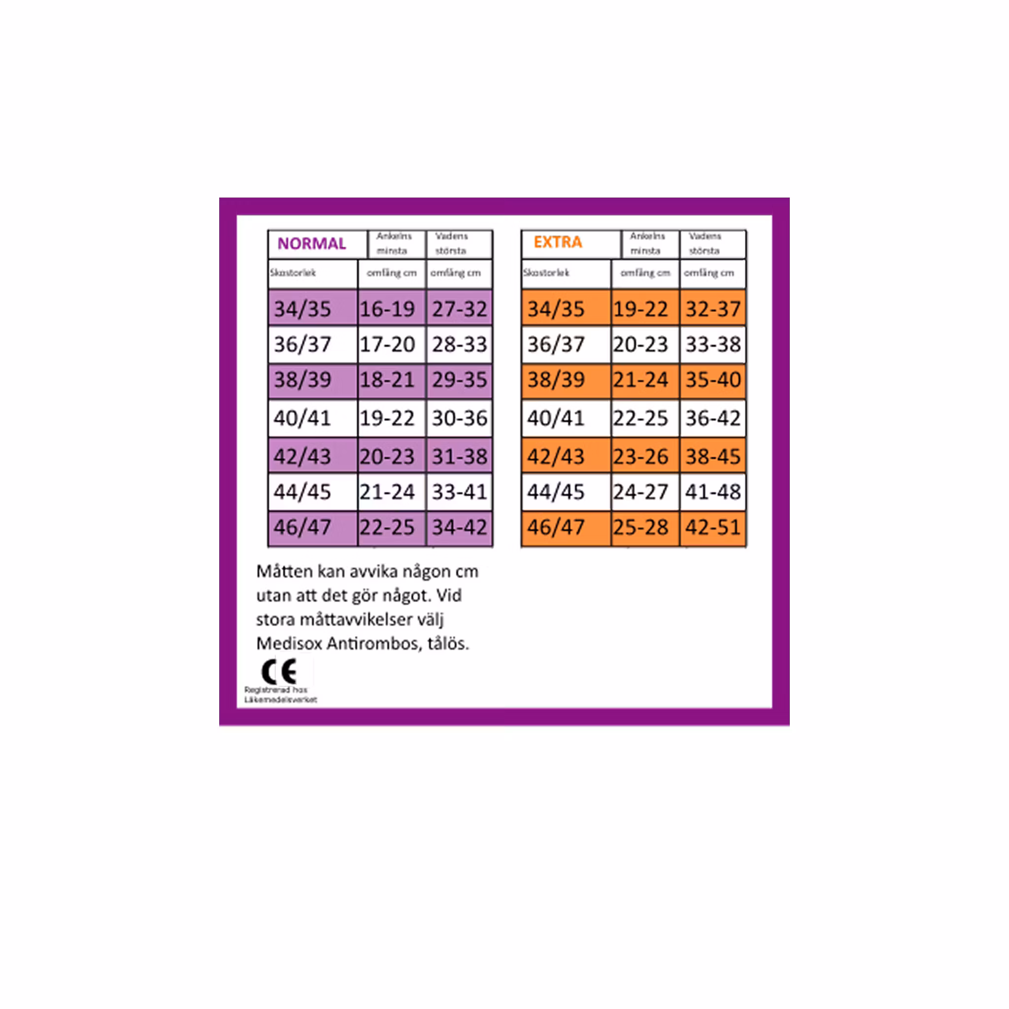 Välj vanligtvis storlek efter din skostorlek ? om du har kraftigare vader eller längre ben rekommenderas du att gå upp en storlek (gäller samtliga Medisox knästrumpor).