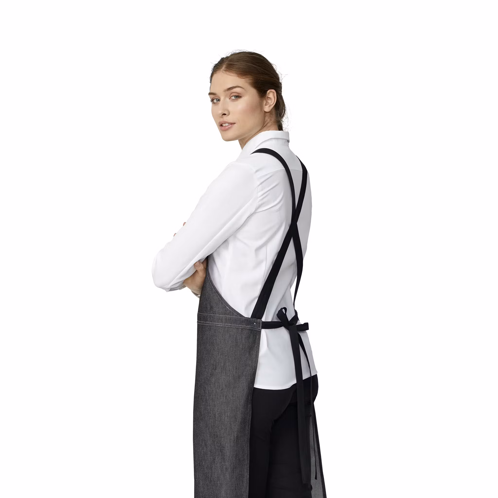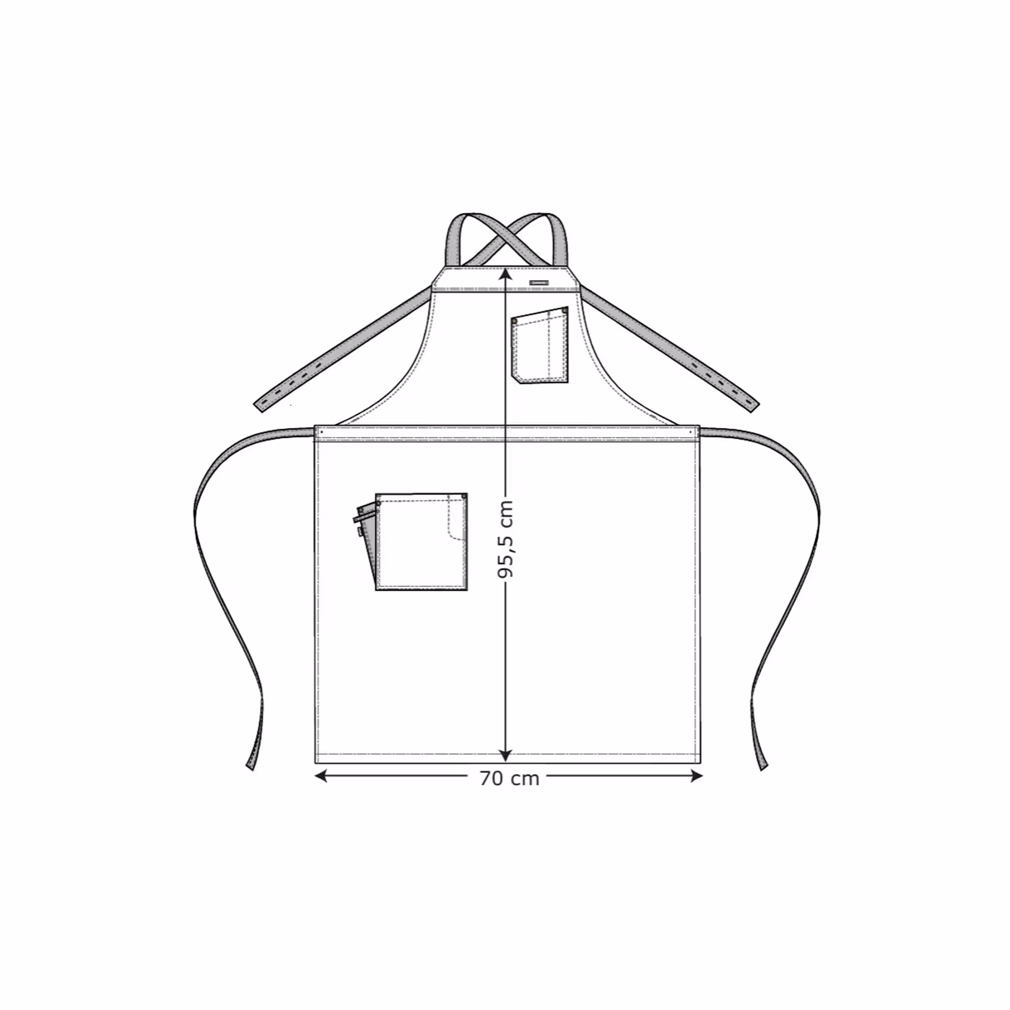 Robust och funktionellt crossback-förkläde i kraftigt material med hög vikt, framtaget för professionell användning i miljöer med högt tempo. Förklädet har korsade ryggremmar som avlastar nacke och axlar samt justerbara ryggremmar med knapp och knapphål för en flexibel och bekväm passform. De sydda banden i kontrastfärg ger ett distinkt uttryck och förstärker den råa, hantverksinspirerade känslan.